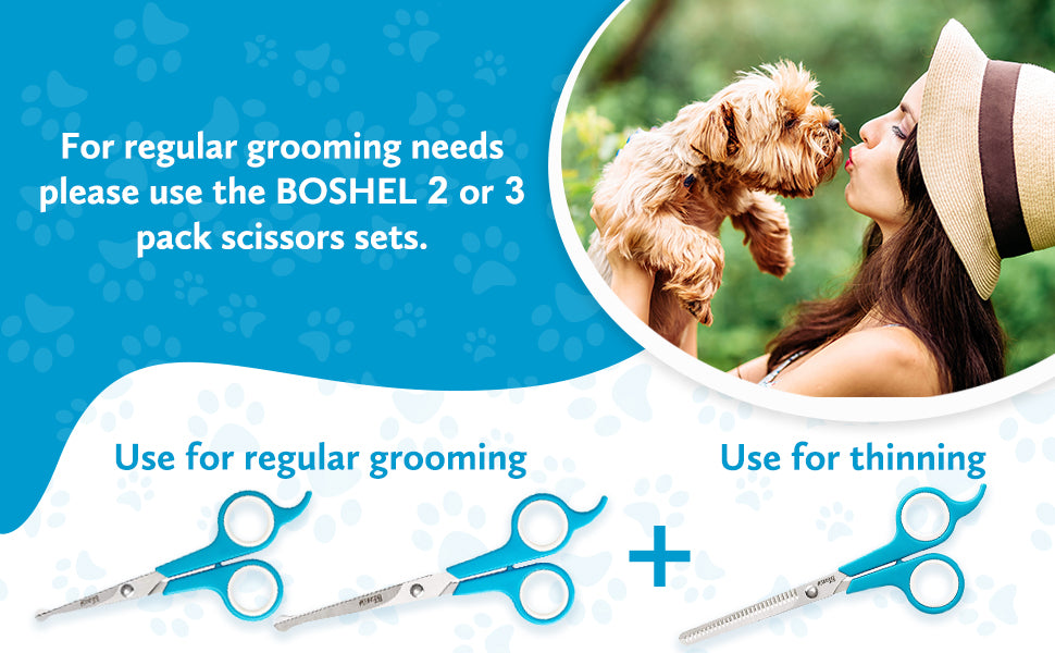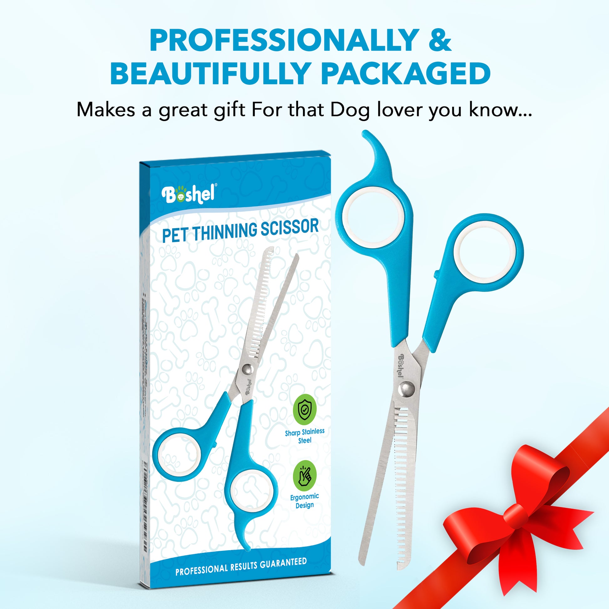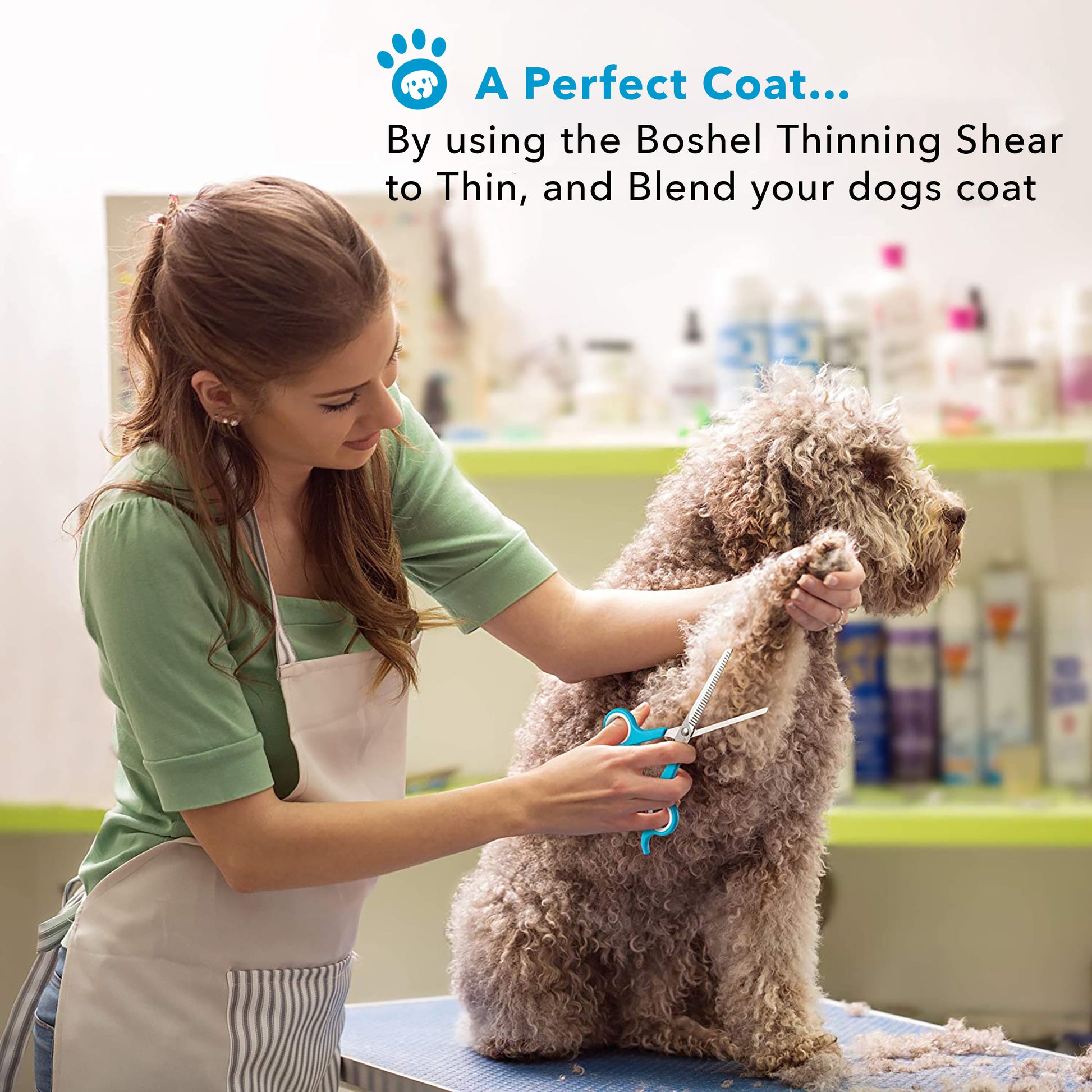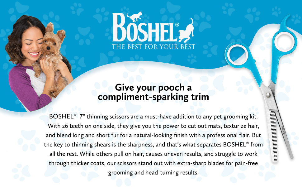 - Results You'll Love -Thin, blend, and texturize your pet’s hair with professional ease. While other dog thinning shears pull on the hair and cause uneven cuts, BOSHEL hair thinning scissors stand out with super-sharp blades for beautiful, pain-free results every time.