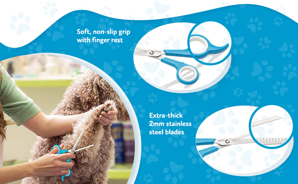 - Experience The Comfort - With a non-slip ergonomic grip, a finger rest, and a removable rubber ring for a custom fit, grooming will be a breeze. Looking for great gifts for dog owners? Our thinning scissors have a smile-sparking touch of color for a great impression.
