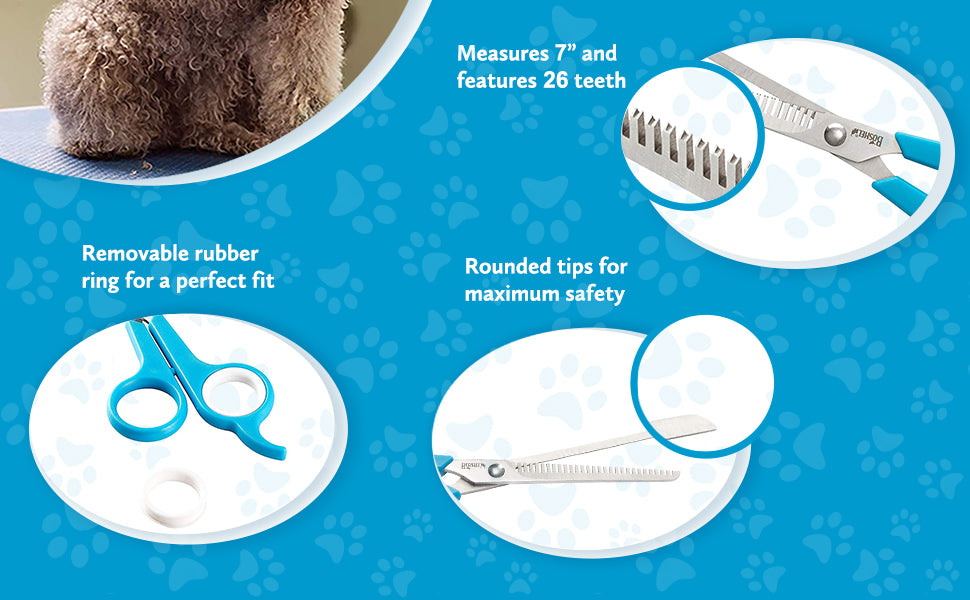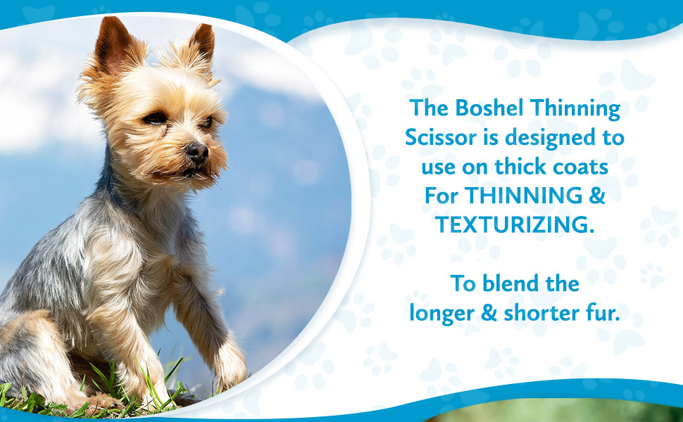 - For All Breeds - Whether your pooch is large or small, with a thick coat of shaggy fur, BOSHEL blending shears get the job done. Each pair of the texturizing shears measure 7” and feature 26 teeth; perfect for cutting out mats, thinning hair, and blending longer & shorter fur.