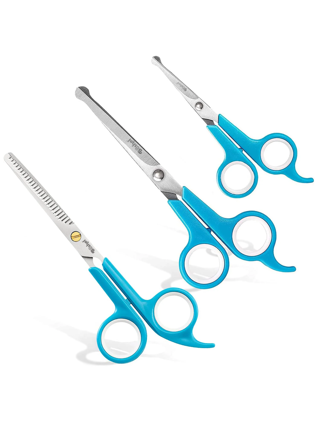 - Groom Like A Pro With The Boshel Grooming Kit - This dog hair grooming kit features 3 Grooming Shears: One 7” straight sharp body scissor, and one 6.5” micro-serrated dog scissors for grooming eyes, face, paws, nose & other sensitive areas, and a 7-inch (26-teeth) thinning scissors for blending, texturizing, and cutting out mats.