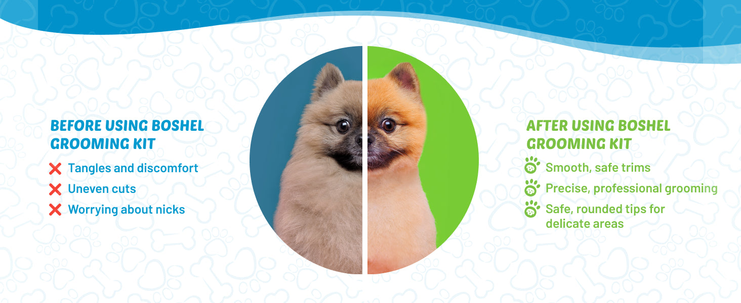 - All In One Kit For Your Pet's Entire Body - This dog shears for grooming kit features 2 Grooming hair scissors: one smooth-bladed long pair for body fur and a smaller pair that features micro-serrated blades for intricate work on their delicate, sensitive paws and face.