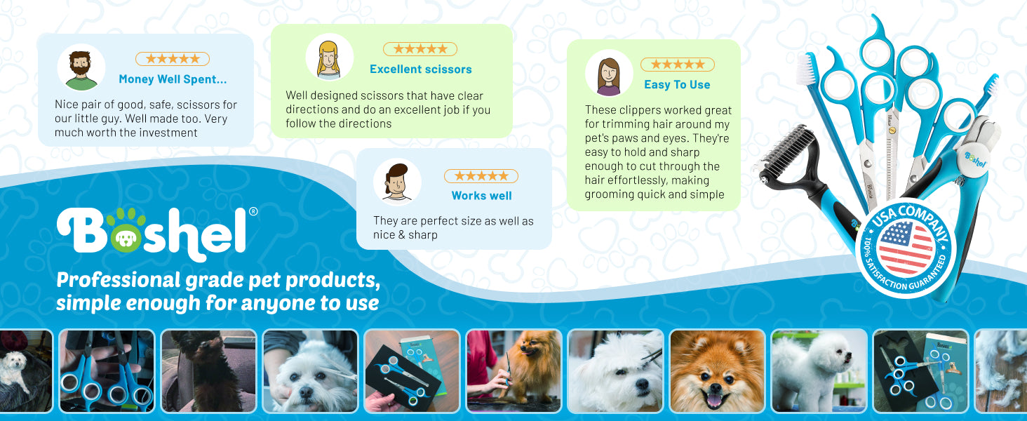 - Updated Newly Improved Screw - Both dog shears feature an upgraded newly-designed, super strong screw to keep the blades tightly together. We've listened to what customers like, and implemented a strong NON-REMOVABLE screw to ensure sturdiness for a long-lasting lifespan. Unlike other competing brands, the Boshel scissors for puppy with the upgraded screw are guaranteed to last for many many years of happy pet grooming.