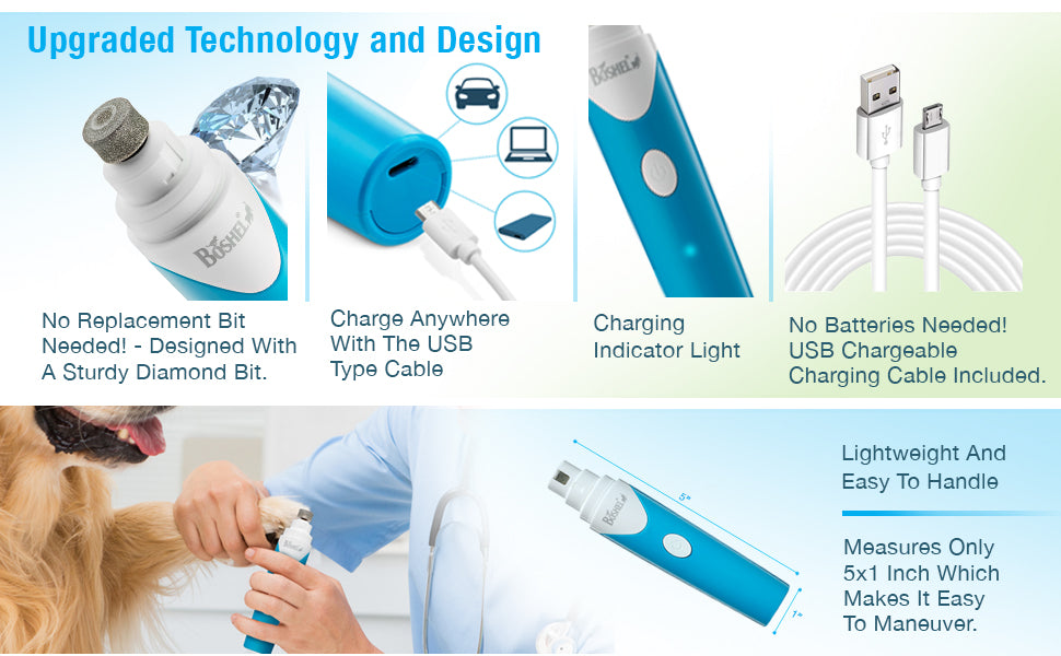 RECOMMENDED BY PROFESSIONALS – The BOSHEL® electric pet nail Grinder is an ergonomically designed powerful and easy-to-use pet trimmer tool for professional in-house grooming, the nail trimmer is recommended by Animal trainers, veterinarians, pet grooming professionals and by our large base of satisfied customers as the best Pet Nail Grinder to use for SMALL and MEDIUM pets.
